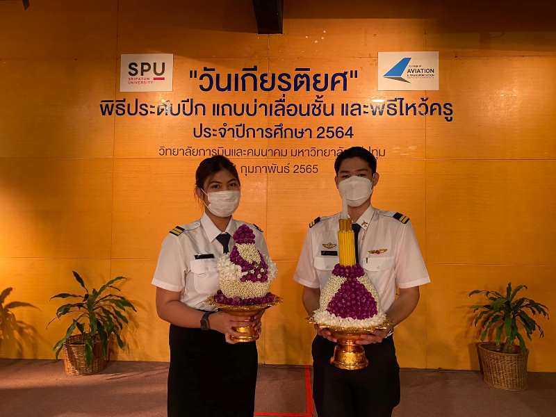 วิทยาลัยการบินและคมนาคม มหาวิทยาลัยศรีปทุม จัดงานวันเกียรติยศ “พิธีประดับปีก แถบบ่าเลื่อนชั้น และพิธีไหว้ครู” ประจำปีการศึกษา 2564 แก่นักศึกษา สาขาการจัดการความปลอดภัยการบิน โดยมี พล.อ.อ.พิธพร กลิ่นเฟื่อง คณบดีวิทยาลัยการบินและคมนาคม มหาวิทยาลัยศรีปทุม ให้เกียรติเป็นประธานในพิธีฯ เพื่อให้นักศึกษาเกิดความภาคภูมิใจในเครื่องแบบการบินและสถาบัน อีกทั้งยังช่วยเสริมสร้างความสัมพันธ์อันดีระหว่างคณาจารย์และนักศึกษา และเพื่อให้นักศึกษาใหม่ได้แสดงความเคารพ ความกตัญญูกตเวทีต่อครูบาอาจารย์ผู้ให้ความรู้แก่ศิษย์ อันจะได้นำความรู้ไปประกอบสัมมาอาชีพ สร้างความเจริญรุ่งเรืองแก่ตนเองและครอบครัว สร้างความเป็นสิริมงคลและรับขวัญนักศึกษาใหม่ในการก้าวเข้าสู่การศึกษาในระดับอุดมศึกษา นอกจากนี้ยังเป็นการอนุรักษ์และสืบสานขนบธรรมเนียมประเพณีอันดีงามของไทยให้คงอยู่สืบไป ณ ห้องบัวหลวงแกรนด์รูม ชั้น 5 อาคาร ดร.สุข พุคยาภรณ์ มหาวิทยาลัยศรีปทุม กทม.(บางเขน) เมื่อวันที่ 24 กุมภาพันธ์ 2565