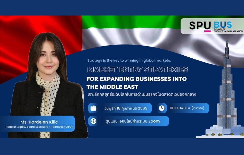 คณะบริหารธุรกิจ มหาวิทยาลัยศรีปทุม (SPU) เปิดโลกความรู้สู่มุมมองระดับสากลให้นักศึกษาสาขาธุรกิจระหว่างประเทศ โดยได้รับเกียรติจาก Kardelen Kilic Head of Legal & Board Secretary – TeamSec (DIFC) ถ่ายทอดองค์ความรู้และประสบการณ์ตรงผ่านระบบ Zoom เจาะลึกกลยุทธ์การเข้าสู่ตลาดตะวันออกกลางอย่างเข้มข้น