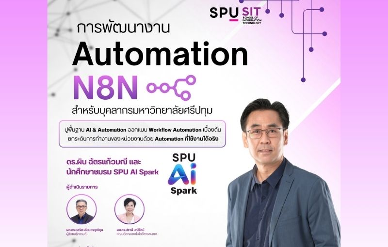 คณะเทคโนโลยีสารสนเทศ มหาวิทยาลัยศรีปทุม (SPU) เตรียมจัดอบรมเชิงปฏิบัติการหัวข้อ “Automation ด้วย AI และ n8n” สำหรับบุคลากรภายในมหาวิทยาลัย เพื่อเสริมสร้างทักษะการทำงานยุคดิจิทัล และยกระดับประสิทธิภาพการทำงานด้วยเทคโนโลยี AI และ Automation อย่างเป็นระบบ
