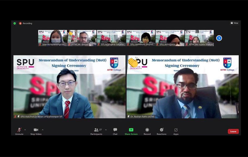 มหาวิทยาลัยศรีปทุม จัดพิธีลงนามบันทึกข้อตกลงความร่วมมือทางการศึกษา (MOU) ในรูปแบบออนไลน์ ระหว่าง คณะสหวิทยาการ เทคโนโลยีและนวัตกรรม (SITI) กับ สถาบัน AITM College, เนปาล โดยมี ผู้ช่วยศาสตราจารย์ ดร.วิรัช เลิศไพฑูรย์พันธ์ รองอธิการบดี มหาวิทยาลัยศรีปทุม และคณบดีคณะสหวิทยาการ เทคโนโลยีและนวัตกรรม กับ Dr.Roshan Rathi CEO Asian Institute of Technology and Management College เพื่อก่อให้เกิดประโยชน์ทางการศึกษาร่วมกัน อาทิ การทำวิจัย ,การออกแบบหลักสูตรการเรียน (Non-Degree)ร่วมกัน รวมไปถึงการมีโครงการนักศึกษาแลกเปลี่ยน ในการฝึกปฎิบัติงานกับบริษัทฯต่างๆและโรงแรม เป็นต้น เมื่อเร็วๆนี้