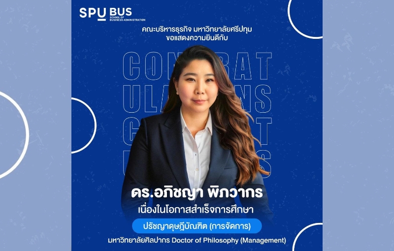 คณะบริหารธุรกิจ มหาวิทยาลัยศรีปทุม (SPU) ขอแสดงความยินดีกับ ดร.อภิชญา พิภวากร หัวหน้าสาขาวิชาบริหารธุรกิจ ในโอกาสสำเร็จการศึกษาระดับปริญญาเอก ปรัชญาดุษฎีบัณฑิต (การจัดการ) จากมหาวิทยาลัยศิลปากร