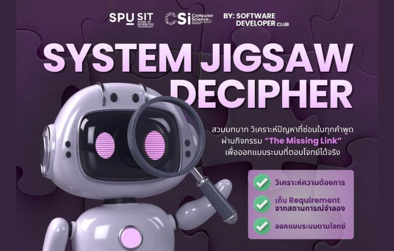 คณะเทคโนโลยีสารสนเทศ มหาวิทยาลัยศรีปทุม (SPU) เตรียมจัดกิจกรรม “SYSTEM JIGSAW DECIPHER” ชวนเหล่านักศึกษา SPU มาสวมบทบาทเป็น “นักสืบสาย Dev” ร่วมไขปริศนา “The Missing Link” ในระบบที่เปรียบเสมือนจิ๊กซอว์ที่ยังต่อไม่สมบูรณ์ ผ่านสถานการณ์จำลองจากโลกการทำงานจริง เปิดโอกาสให้ผู้เข้าร่วมได้ฝึกทักษะสำคัญของนักพัฒนาระบบ ตั้งแต่การ วิเคราะห์คำพูดของลูกค้า เก็บ Requirement อย่างแม่นยำ ไปจนถึงการออกแบบระบบ (System Design) ให้ตอบโจทย์ธุรกิจอย่างมืออาชีพ โดยกิจกรรมจะจัดขึ้นในวันที่ 14 มีนาคม 2026 เวลา 09.00 – 16.30 น. ณ ห้อง 5-902 มหาวิทยาลัยศรีปทุม กทม. รับจำนวนจำกัดเพียง 40 คน สำหรับนักศึกษา SPU เท่านั้น เพื่อร่วมพิสูจน์ว่า ทีมใดจะสามารถค้นพบ Missing Link ของระบบได้ก่อน ในสนามท้าทายที่ผสานการเรียนรู้กับการลงมือปฏิบัติจริงอย่างเข้มข้น