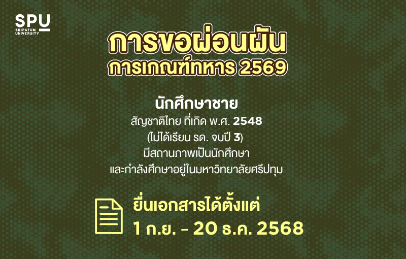 มหาวิทยาลัยศรีปทุม ขอแจ้งแนวทางการดำเนินการสำหรับนักศึกษาชายที่ประสงค์จะยื่นคำร้องขอผ่อนผันการตรวจเลือกเข้ารับราชการทหาร ประจำปี 2569 เพื่อให้ทราบขั้นตอน เอกสารที่ต้องเตรียม และสามารถยื่นขอผ่อนผันได้อย่างถูกต้องและรวดเร็ว ตามรายละเอียดดังต่อไปนี้
