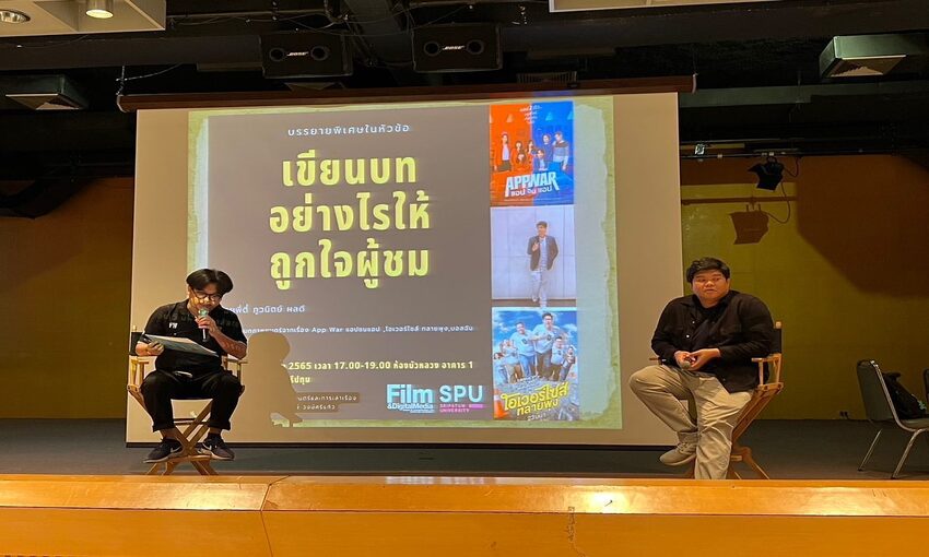 นักเขียนบทภาพยนตร์ไทย จากเรื่อง App War แอปชนแอป และ โอเวอร์ไซส์ทลายพุง ในวันที่ 2 พฤศจิกายน 2565 เวลา 17.00-19.00 น. ห้องบัวหลวง ม.ศรีปทุม โดยนักศึกษาสามารถนำเทคนิคและกระบวนการไปพัฒนาการวิธีการเล่าเรื่องในบทภาพยนตร์ได้