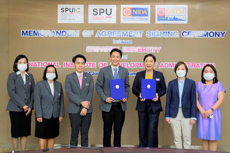 วิทยาลัยนานาชาติ มหาวิทยาลัยศรีปทุม (SPUIC) ร่วมกับ สถาบันบัณฑิตพัฒนบริหารศาสตร์ (NIDA) จัดพิธีลงนามบันทึกข้อตกลงความร่วมมือทางวิชาการ MOU ในการสร้างหลักสูตรนานาชาติ 2 ปริญญา 4.5 ปี ตรี-โท SPU-NIDA โดย อาจารย์เกรียงไกร พุคยาภรณ์ คณบดีวิทยาลัยนานาชาติ มหาวิทยาลัยศรีปทุม และ ผศ.ดร.ไพฑูรย์ มนต์พานทอง คณบดีคณะการจัดการการท่องเที่ยว สถาบันบัณฑิตพัฒนบริหารศาสตร์ ลงนามบันทึกข้อตกลงความร่วมมือฯร่วมกัน เพื่อสร้างบุคลากรที่มีความรู้ ทักษะ ความสามารถขั้นสูงตอบโจทย์ประเทศ ในด้าน Multi-Skilled People ซึ่งมี ผศ.ดร.วสวัตติ์ สุติญญามณี ผู้ช่วยคณบดีฝ่ายวิชาการ วิทยาล้ยนานาชาติ มหาวิทยาลัยศรีปทุม พร้อมด้วย รศ.ดร.กนกกานต์ แก้วนุช รองคณบดีฝ่ายกิจการต่างประเทศ และผศ.ดร.แสงแข บุญศิริ รองคณบดีฝ่ายวิชาการและกิจการนักศึกษา คณะการจัดการการท่องเที่ยว สถาบันบัณฑิตพัฒนบริหารศาสตร์ ร่วมลงนามเป็นสักขีพยาน ณ ห้องบอร์ดรูม ชั้น 14 อาคาร 11 มหาวิทยาลัยศรีปทุม กทม.(บางเขน) นอกจากนี้ภายในงานฯ ยังได้จัดให้มีกิจกรรมการเสวนาวิชาการ หัวข้อ “The Future Trend of Tourism and Hospitality Industry after COVID-19” ซึ่งเป็นส่วนหนึ่งของพิธีลงนามความร่วมมือในครั้งนี้ด้วย