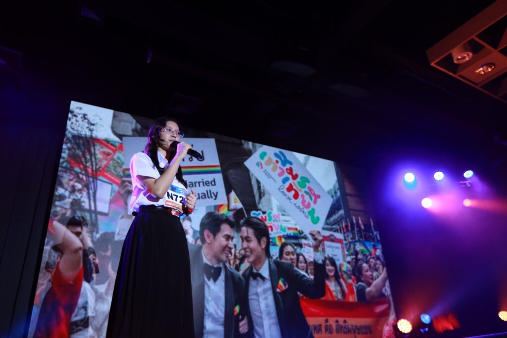 พี่อยากให้น้องๆ ทุกคน ทำให้เต็มที่ตั้งแต่อยู่ในห้องเรียนค่ะ ไม่ว่าท้ายที่สุดแล้วจะได้เป็นตัวแทนไปแข่งหรือไม่ แต่ ประสบการณ์จะเป็นของน้องๆ ไปตลอดแน่นอน อยากให้ตั้งใจฝึกซ้อมและพร้อมรับคำแนะนำจากเพื่อนและอาจารย์ สิ่งสำคัญคือ กล้าคิดกล้าพูดค่ะ อย่างตอนที่พี่มีไอเดียว่าจะเล่าเรื่อง Stonewall Riots มันค่อนข้างแตกต่างจากคนอื่น แต่พี่กล้าที่จะเดินเข้าไปถามอาจารย์ว่า พี่เล่าเรื่องนี้ได้ไหม นั่นคือจุดเริ่มต้นของความสำเร็จของพี่ในครั้งนี้ค่ะ พี่จะคอยเป็นกำลังใจให้น้องๆ ทุกคนเสมอนะคะ