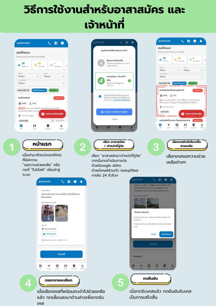 ในส่วนฟีเจอร์สำหรับอาสาสมัคร ถูกออกแบบขึ้นจาก “ปัญหาที่เกิดขึ้นจริงในพื้นที่” โดยปกติ อาสาจะรับเคสผ่าน LINE หรือโทรศัพท์ ซึ่งไม่มีระบบตรวจสอบจึงเกิดเหตุซ้ำเคสบ่อยครั้ง FloodAidSouth จึงทำให้ทุกอย่างเป็นระบบเดียวกัน อาสาเพียงเข้าสู่ระบบด้วย Gmail เพื่อยืนยันตัวตน จากนั้นระบบจะพาไปยังหน้าแสดงเคสทั้งหมดที่ผู้ประสบภัยแจ้งเข้ามา แบ่งตามความเร่งด่วน อาสาสามารถเลือกเข้าไปดูรายละเอียด เช่น ชื่อผู้แจ้ง เบอร์โทร และตำแหน่งที่ปักหมุด จากนั้นกด “รับเคส” เพื่อช่วยเหลือ เมื่อกดยืนยัน ระบบจะล็อกเคสนั้นให้กับอาสาคนนั้นทันที ป้องกันการซ้ำซ้อน ซึ่งฟีเจอร์นี้ช่วยให้การทำงานมีทิศทาง ไม่สูญเวลา และรู้ชัดว่าเคสใดได้รับการช่วยเหลือแล้วหรือยัง