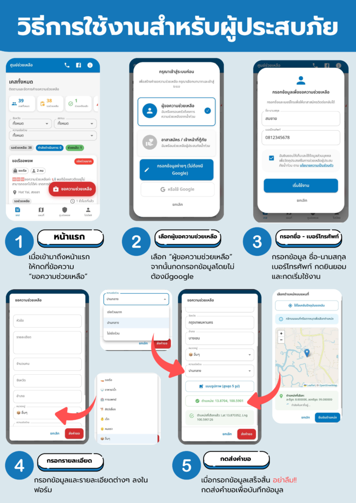 เมื่อเข้าสู่ระบบแล้ว หน้าหลักของผู้ประสบภัยจะถูกแบ่งออกเป็นเมนูที่จำเป็นที่สุด ได้แก่ 1.แผนที่รวมจุดช่วยเหลือ 2.ขอรับสิ่งของ 3.ขอความช่วยเหลือ 4.จุดรับบริจาคใกล้เคียง โครงสร้างแบบนี้ช่วยให้ผู้ประสบภัยมองเห็นทุกสิ่งที่เกี่ยวข้องกับความอยู่รอดของตัวเองในหน้าเดียว