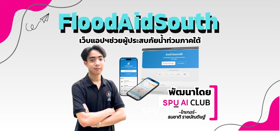 นักศึกษาทีม SPU AI Club นำโดย ไทยเกอร์-ธนชาติ ราชบัณดิษฐ์ นักศึกษาปี 1 คณะเทคโนโลยีสารสนเทศ สาขาวิศวกรรมคอมพิวเตอร์ และเพื่อนจากหลายคณะ เมื่อเห็นความเดือดร้อนของพี่น้องในพื้นที่ จึงรวมพลังกันสร้างแพลตฟอร์ม FloodAidSouth ขึ้นมา เพื่อให้ผู้ประสบภัยสามารถ “ปักหมุดขอความช่วยเหลือได้ทันที” และส่งข้อมูลต่อให้อาสาสมัครแบบเรียลไทม์