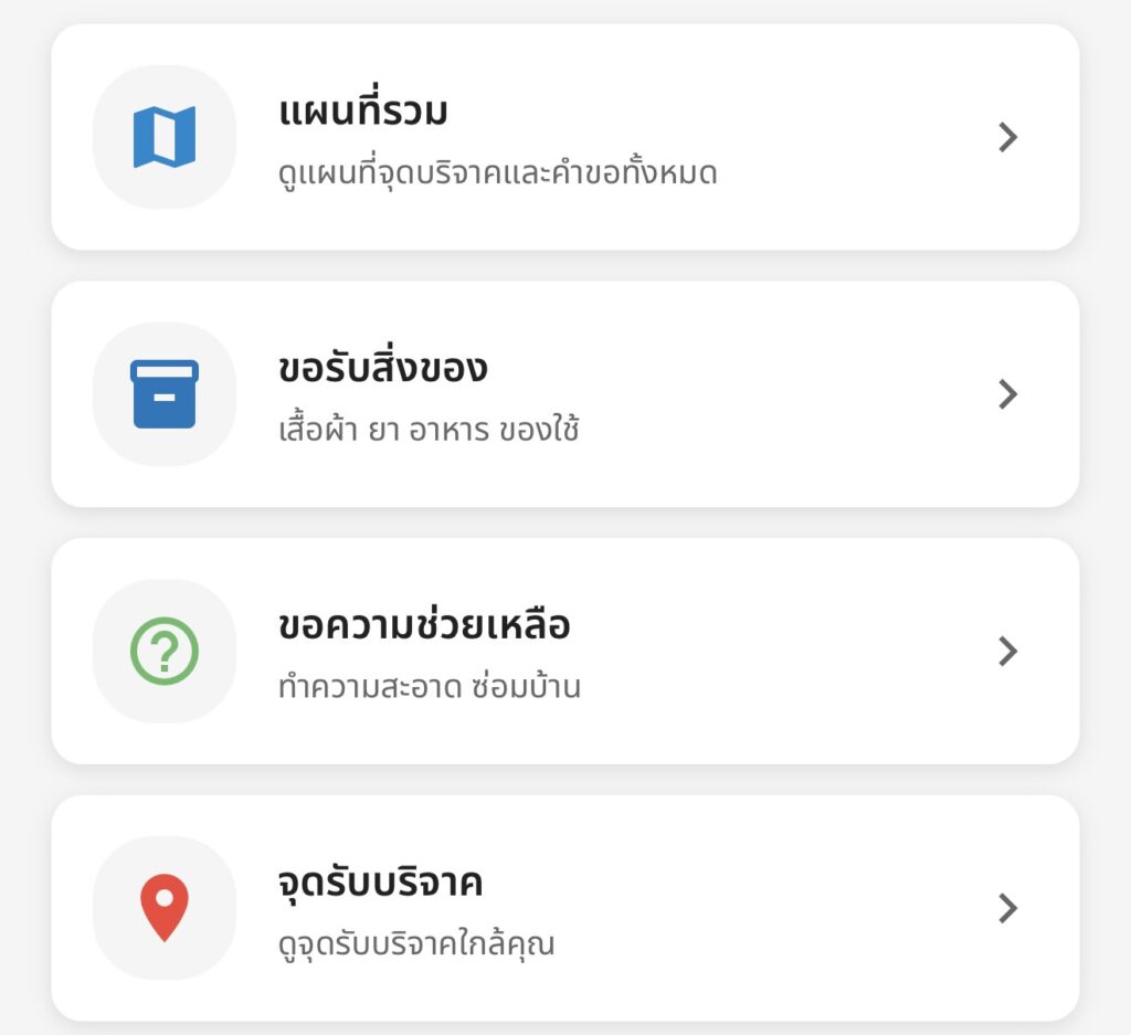 หนึ่งในฟีเจอร์ที่มีคนใช้มากที่สุดคือระบบ “ขอรับสิ่งของ” ซึ่งออกแบบมาเพื่อแก้ปัญหาการบริจาคที่ไม่ถึงมือจริง โดยเน้นให้ผู้ใช้สามารถเลือกสิ่งของที่จำเป็น เช่น อาหาร น้ำดื่ม เสื้อผ้า ยารักษาโรค หรือของใช้ทั่วไป และระบุจำนวนที่ต้องการได้ จากนั้นกรอกข้อมูลสิ่งของ ระบุจำนวน และระบุตำแหน่งปัจจุบัน เพราะระบบจำเป็นต้องส่งข้อมูลให้ทีมจัดส่งหรือเจ้าหน้าที่ในพื้นที่นำของไปถึงจุดนั้นได้ถูกต้อง หากลืมระบุตำแหน่ง ระบบจะไม่บันทึกคำขอทันทีเพื่อป้องกันการส่งข้อมูลผิดพลาด เมื่อกรอกข้อมูลครบแล้ว ระบบจะแสดงให้ตรวจสอบอีกครั้ง และปิดท้ายด้วยปุ่ม “ส่งคำขอ” เพื่อบันทึกเข้าระบบกลาง ซึ่งทีมอาสาและจุดบริจาคจะเห็นแบบเรียลไทม์