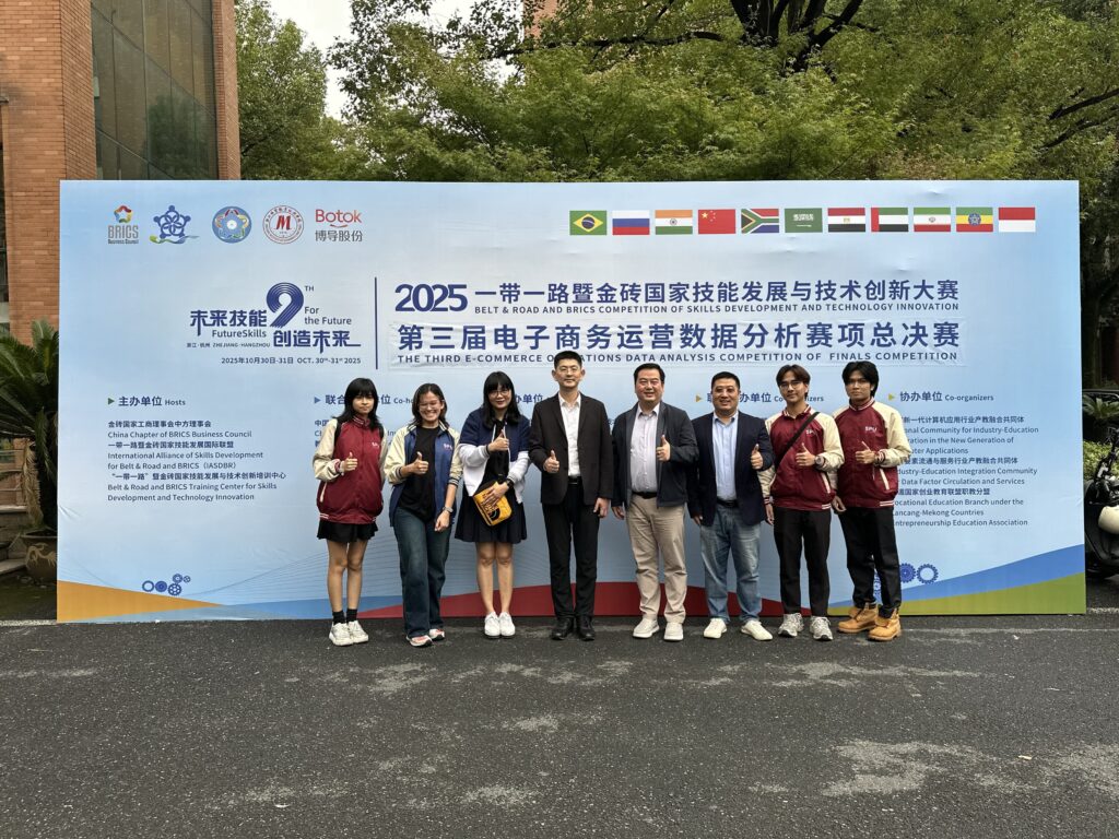 เวทีที่พวกเขาเข้าร่วมคือ “2025 Belt & Road and BRICS Competition of Skills Development and Technology Innovation – Track of E-commerce Operations Data Analysis Competition” การแข่งขันระดับนานาชาติด้าน E-commerce Intelligence และ Data Analytics ซึ่งจัดขึ้น ณ เมืองหางโจว สาธารณรัฐประชาชนจีน เมืองศูนย์กลางอีคอมเมิร์ซระดับโลกที่อัดแน่นไปด้วยเทคโนโลยีและนวัตกรรมล้ำสมัย